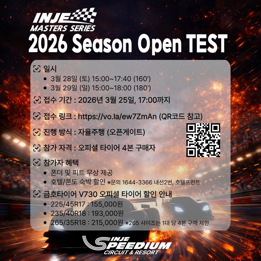 테스트 일정은 3월 28~29일. 오피셜 타이어(금호) 4본을 구매하면 이틀 동안 테스트에 참가할 수 있다. 신청 접수(https://vo.la/ew7ZmAn)는 3월 25일 오후 5시까지 받는다.
