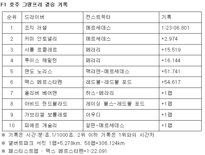 FP3에서 경주차가 크게 파손되는 사고의 여파를 극복한 안토넬리가 2위. 레이스 전반에 드러난 상승 무드를 놓친 르클레르에게는 3위 트로피가 돌아갔다. 팀의 원스톱 작전에 아쉬움을 전한 해밀턴은 4위. 지난해 호주 그랑프리 위너 노리스는 5위로 피니시라인을 갈랐다.